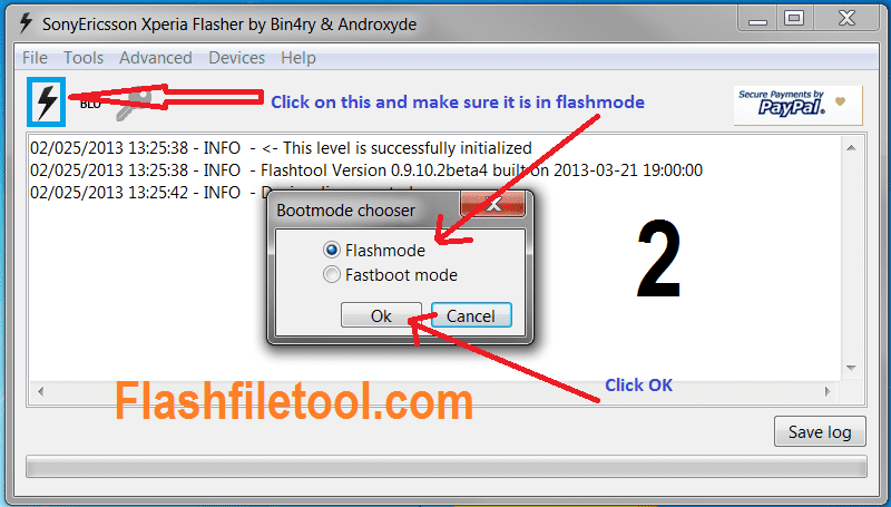 - Now for flashing, Run the FlashTool, and select the bootloader mode “Flashmode” and click “Ok”